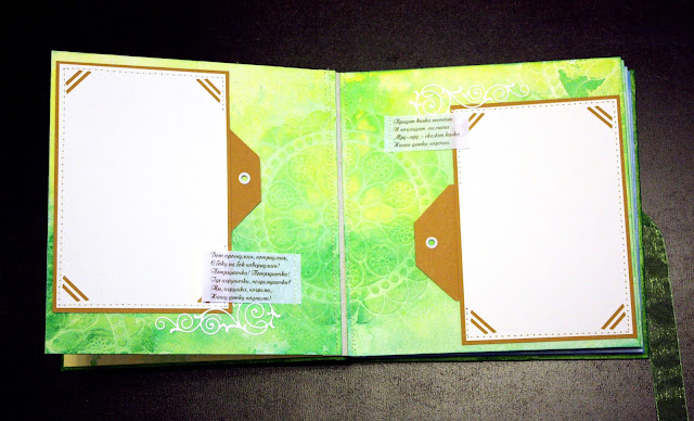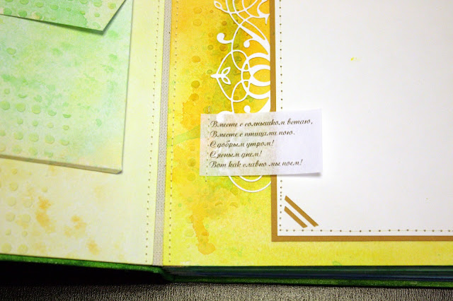 Давно засматривалась на работы миксд-медиа, а попробовать было страшновато, но другого выхода не было. Наткнулась на мастер-класс http://scrapportal.ru/mk/shkola-skrapbukinga-etap-2-urok-3-albom-miks-media-s-tkanevyim-perepletom. Очень понравилась идея с цитатами, но так как для детского альбома цитаты найти сложно, а фразы вроде "первая улыбка", "первое купание" и все такое "первое" казались мне не очень подходящими к такому не совсем обычному детскому альбому, то в основу идеи альбома были заложены детские потешки! Цвета для разворотов подбирала, отталкиваясь от содержания потешек. Про утро - желтый, оранжевый, о прогулке - зеленый, желтый, про купание и сон - синий голубой, зеленый.