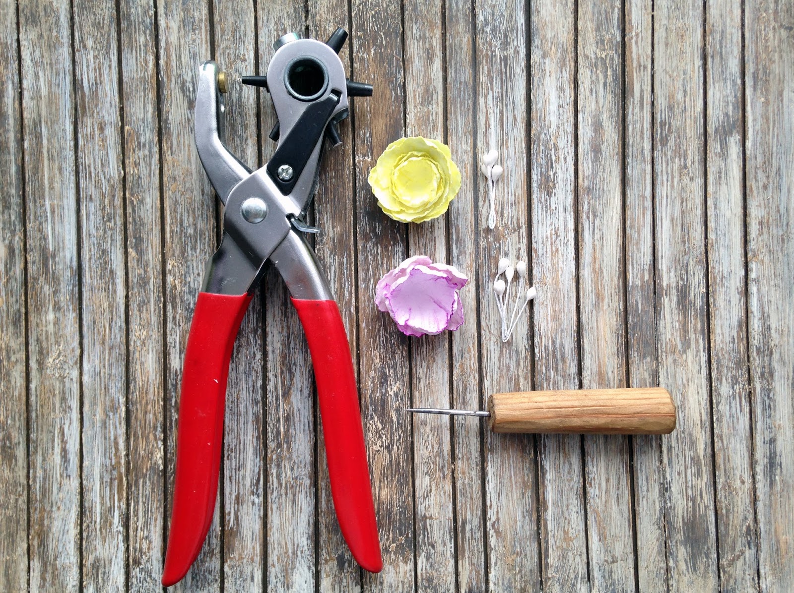 Когда наши заготовки высохли, необходимо их склеить между собой. Для этого понадобится клей (например, Момент кристалл). Вкладываем заготовки друг в друга, нанося небольшое количество клея на каждую заготовку. Убедившись, что всё приклеилось, вооружаемся шилом (можно заменить на пробойник или даже маникюрные ножницы), готовим тычинки. Протыкаем наш цветок посередине.