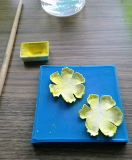 Итак, нам понадобятся: шаблоны цветов (прикреплены в конце поста) из акварельной бумаги (можно распечатать прямо на акварельке, либо вырезать шаблоны большого и маленького и их обвести), краски акварельные, 2 емкости с водой (одна для кисточки, вторая для заготовок), кисточка, салфетка бумажная, что-нибудь мягкое (я использую обратную сторону ненужного силиконового молда), согнутая проволока (для имитации прожилок, но можно и без нее - кому как нравится), палочка с шариком на конце (с синей ручкой на фото). Заготовки цветочков необходимо надрезать (в конце поста также прикреплен файл с надрезами)